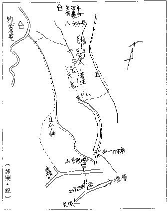 発会記念山行 昭和四十四年五月ー八日 矢板岳友会発足記念山行を高原山の木ノ芽沢にて実施したのは 会としてある意味を込めていた。 高原山は、塩原火山群の総称で、スキー場として名高い鶏頂山 のある山といった方がわかり易い。この山の東側に八方ケ原とい う放牧場があり、その東端につきあげている小さな沢が木ノ芽沢 である。 矢板市内及びその近郷に住む会員は、それぞれ県内外の比較的 大きな山々に各自のトレイルを印して来た連中であるが、那須と 高原山の中間部においては身近にありながら薮山であまり魅力を 感じていなかったせいか、一部の山域を除いて会として未知の山 々であつたわけである。そんな会員の今後の活動方針として、栃 木県北のこれらの山域に積極的に足を踏み入れるべきだという意 見に一致を見、その手始めに選定されたのがこの沢であった。 この後、那須山域の白水沢と苦土川の沢登りの記録集を二回発 表するまでになり、さらに継続テーマとして塩原山域の沢へと活 動を予定している会の活動の出発点でもあったわけである。さら に、今まで大して見向きもされなかった小さな沢でも以外に立派 なフォールがあったりして、近くの薮山の良さを再認識するには 木ノ芽沢は一番手頃であると判断して案内したわけである。距離 的に近く、しかも高原山登山者のほとんど入り込まないここは、 ガイドブックにも登山道として発表されていないため、静かで澄 んだ水の流れあり、会員にも気に入られたと見えて、その後忘年 山行や山菜会やらと何度か利用されるに至っている。 ここの良さは春先にある。木ノ芽沢の名前通りだ。バス終点の 山県農場から木ノ芽沢林道終点付近までの間約一時間、イチリン ソウ、ニリンソウ、ヤマプキソウ、エンレイソウ、シュンラン、 ユイザンスミレ、イカリソウ、と次々に眼を楽しませてくれる。 林道第二の橋より五十mほどの下の崖からは二枚貝の化石が多量 に出、さらに崖より一本の滝が出ている。飲んベーどもは養老の 滝と名付けて喜んでいたが、この一帯はフキやタカナが多い。林 道終点より右岸を歩くと砂防ダムがあり、このちょっと上より沢 に下る。ここから二俣までは大きな石の上を飛びはねたりして左 岸、右岸へと何度か変わりながら歩くのだが、イワタバコやヤシ オツツジの群落に出会い疲れなど出るはずもない。この沢の左岸 の上の尾根には登山道があるが、ほとんど通る人もなく、中間付 近の岩場にはセンボンヤリが咲いている。右岸の尾根にある登山 道が八方ケ原へのハイカーの通る道である。砂防ダムより二時間 ほどで二俣に出る。この一帯にはヒトリシズカ、キクザキイチリ ンソウ、ゴンベロ(カタクリの地方名)の群落がある。この二俣 には二段の滝があり、トンボの滝と云っているが、いつ来てもこ の付近での昼食は楽しい。ここより右俣の方が滝も多く、沢とし ても面白いが、今回は左俣へ入ることにした。途中五mの滝が一 本あるだけで、沢の水もほとんどなくなったあたりより左の薮に 逃げ登山道へ出た。二俣より約二時間である。山県農場まで一時 間ちょつと飛ばして下山、さらに上伊佐野まで歩いてバスに乗る。 駅前で飲んだビールのうまさにもまして会員の親睦を深め、楽し い笑いのうちに終了出来たし、このムードが今も会の中に脈打っ ている事を考えると大成功であったと自負している。 (参 加 者)小林、吉野、浅川、白石、近藤、落合、蓮實 (コースタイム)8:00矢板駅−8:35山県農場−9:15〜9:35第2の橋 −11:40〜12:30トンボの滝 −2:20登山道 −4:00 山県農場−5:08上伊佐野ー5:30矢板駅 (略 図)