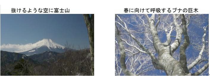 仙人通信32(鳥の胸山1208m) 鳥の胸山は道志道の駅と道志川を挟んで南側に位置した独立峰でミニ鹿嶋槍なんて云われている。 昔は殿群山だったらしいのだが、変遷したらしい。40年位前に買った昭文社の丹沢編には名前すら載て ない山であったが、山梨100名山となってから有名になり、ガイド等に載るようになったようだ。 土曜日に降った雪で、真白に化粧した富士山に期待して、道の駅に車を置いて登ってみた。 道志川を渡り、さらに先のせせらぎの橋に道標があるが、ガイドでは手前を曲がれとある。急ぐ登山で もないので、道標に従い雪の林道をノンビリと歩く事にした。林道は桧の巨木に覆われて、時折吹く風 で枝に積った雪を頭上に撒き散らせ、それがダイアモンドダストよろしくキラキラと綺麗だ。 足元の雪も降雪4日目と言うこともあり、15cm位に締まって歩き易い。 40分程歩くとガイドにあったグリーンロッジからの登山道とクロスした。体も温まりウオーミングアッ プになったようだ。程なく林道は消えて登山道となった。南西面は桧と杉の植林帯であり、北側は小楢 等の落葉樹でこの境界に登山道が作られている。右手に菜畑山と赤鞍岳を見ながら30分程急なジグザク を登る。全体が落葉木となり明るくなり、振り合えると真白な富士山が菰釣山と御正体山を両側に控え させて胸を張る。程なく小さなピークがあり、尾根道に変わった。落葉樹の梢の先に道志道に沿って白 く化粧した袖平山等も見える。6本爪アイゼンの往復の踏み跡以外には誰も登っていないようだ。 登り初めて1時間45分で山頂に立てた。ここだけは富士山方向に木がなく、真青の空に白く浮かび上が る富士山を眺めた。山頂は2つのピークがあるが、2つ目からの眺望は0に等しい。これより先は 踏み跡もなく、木に付けられた赤い布切れを見落とさないように平指山に向かう。平指山への登りから はブナが多くなり、奥丹沢のイメージである。山頂からは桧洞丸・大室山・加入道山もよく望める。 ここから大界木山と思っていたのだが、踏み跡もなく不明のため、道志の森キャンプ場へのルートとし た。桧の枝打ちがされており、城ヶ尾山から菰釣山・そして富士山の山頂が良く見える。 急な桧の林を30分程下ると三ヶ瀬川の東沢に出た。 地図によると東沢の上流には水晶橋と言うのがある。水晶でも採れたのか?。 鳥の胸山は丹沢の中心にある石英閃緑岩の北の端であり、この沢は石英閃緑岩との接触変成帯であるこ とから、菫青石・パンペリー石・ぶとう石等のトレージャーストーンが探せるかと思い、沢の冷たい水 の中を30分もあさってみたが、斜長石と石英閃緑岩の小石のみでした。 (用木沢の出会いから白石峠に掛けては、菫青石・ペンパリ-石等があることで知られている) 欲張った4時間強の山歩きは、子供に帰れた楽しいものでした。(h18.1.24)