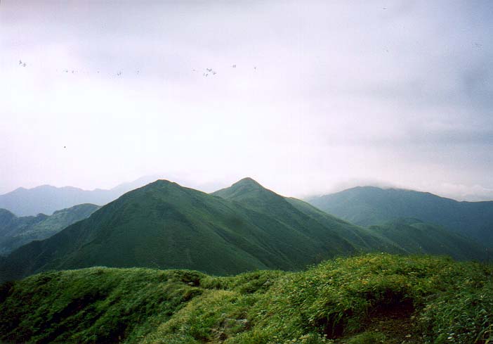 北股岳から手前に梅花皮岳とその右後方に烏帽子岳を眺める