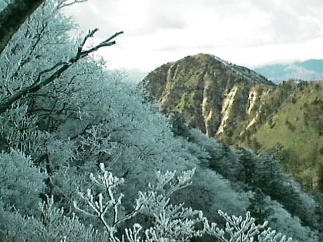 釈迦ケ岳北面の霧氷の後方に鶏頂山を望む