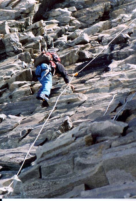ABCからC2間の岩場にて(ロッククライミングする仲里さん)
