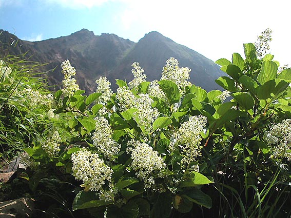 剣が峰の巻き道で、逆光に浮かび上がったクロヅルの白い花に出会った。この花は真夏の那須を代表