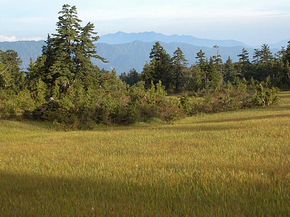 上田代からは平ヶ岳と荒沢岳を傾斜湿原越に見ることができる。写真中央奥の山並みが荒沢岳だ。 平ヶ岳は写真のもう少し左だが写っていない。