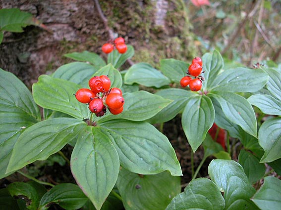 ゴゼンタチバナ:ミズキ科、ゴゼンタチバナ属、常緑の多年草、漢字名→御前橘、御前は白山の最高