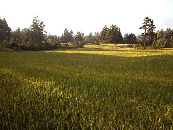 ここ、上田代はひうち裏林道中一番大きな傾斜湿原だ。湿原は早くも狐色になり始めていた。この湿 原には雪解け後、目立たないがヒメシャクナゲが一面に咲く。あまり派手な花はないが秋にはピカ一の 日本庭園のように衣替えして訪れた人の心を捉えてやまない。