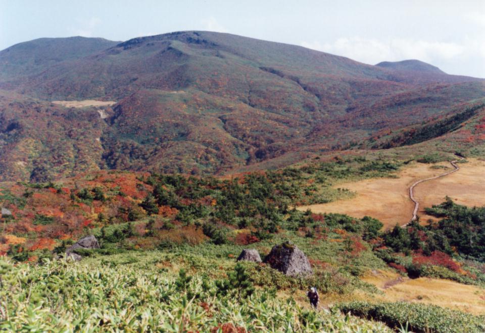 秣岳の登りから栗駒山を望む (編者注:画面下中央右よ寄りに写っているのが奥様です。)