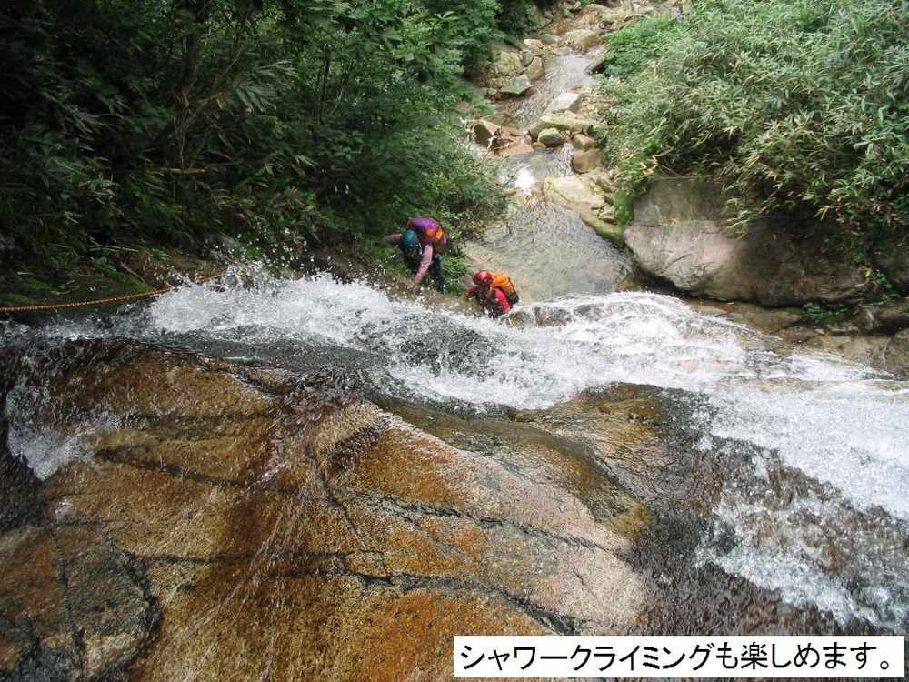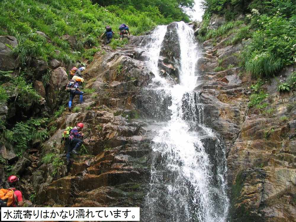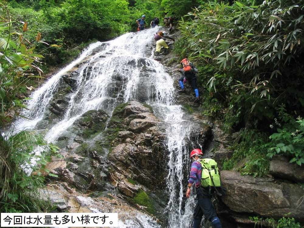 られます。最初の小滝を越え尚も進むとF1に差し掛かります。今回は人数が多い事もあり、直登Grと高巻きGrと