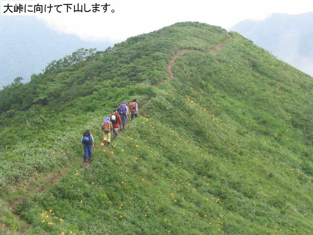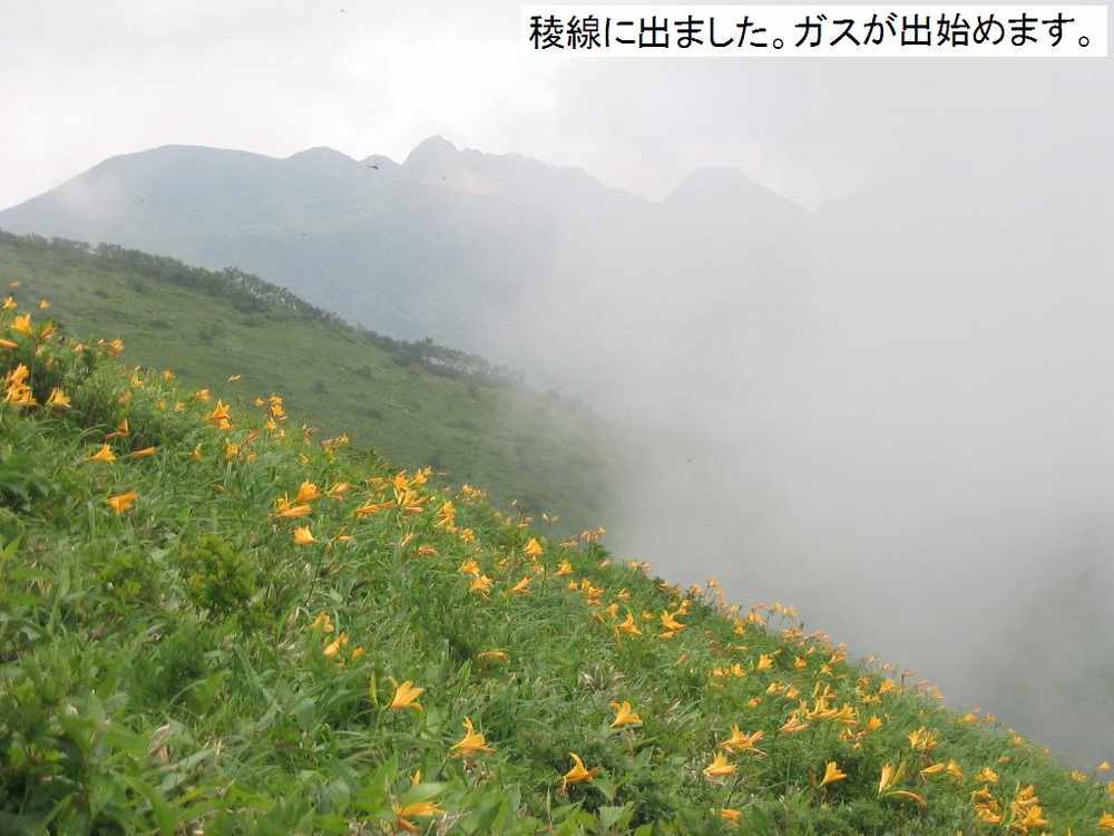 コウキスゲが咲いています。いつもはガス、ガス、ガスの稜線ですが、今日は目の前に茶臼〜朝日への縦走路を