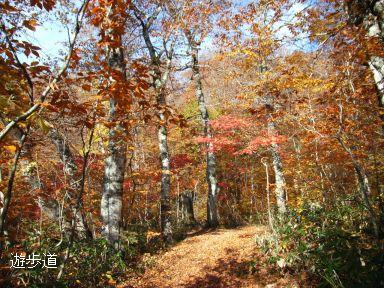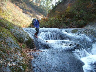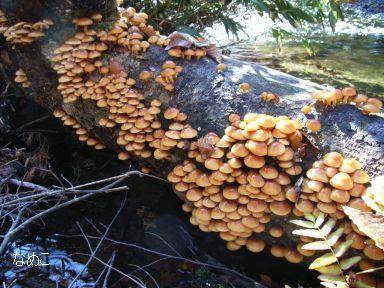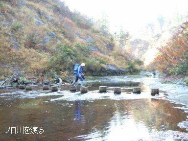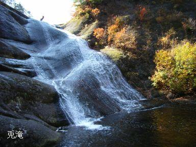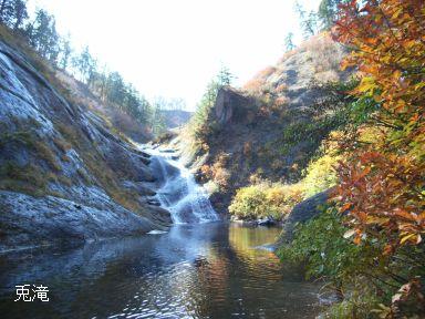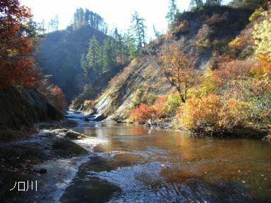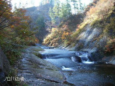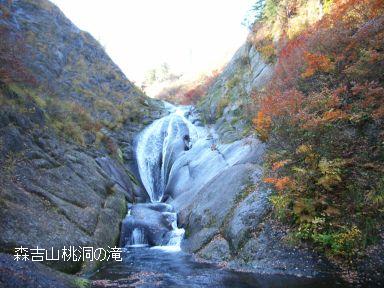 《日時》 10月26〜28日 《参加者》小林×2 《日程》 10/26 矢板発11時〜(東北道)十和田IC〜森吉山親子ふれあいキャンプ場午後6時(テント泊) 10/27 キャンプ場発8時半〜森吉山野生鳥獣センター〜クマゲラ保護センター〜桃洞の滝〜 赤水沢分岐〜兎滝〜野生鳥獣センター〜三つ又温泉泊 10/28 温泉〜栗駒高原〜鳴子〜寒河江〜喜多方〜矢板 《要約》 森吉山ノロ川の「桃洞の滝、赤水沢兎滝」と三つ又温泉 《本文》 天候回復を待って一週間遅れの出発となったが、一路東北道をひた走り十和田ICから森吉山に向かう。 予定していた森吉山親子ふれあいキャンプ場には暗くなってから到着したが、あまりの広さに吃驚!管理人 も居ないので水道とトイレの近い場所にテントを設営する。無料のキャンプ場で超お薦め?満天の星空で明 日の天気も期待できそうである。 27日 野生鳥獣センターまで移動する。駐車場も広くクマゲラ保護センターまで10分の距離である。紅葉 はすこし遅めではあるがブナの黄色がまぶしい。赤水沢分岐を左に桃洞の滝に向かう。礼儀を知らないカメ ラマンが数人三脚を道一杯に広げて屯している。桃洞の滝は朝日が当たらず、紅葉もいまいち?滝の造形に は連れも納得の様子であるが、さてどう!表現したらよいのだろうか?待っていても太陽はまだまだ到達し そうもないので、赤水沢分岐まで戻る。ノロ川を渡渉して巻き道の登山道を行くが沢が行く手を遮るところ で、地下足袋にわらじでは冷たそうなので沢靴に履き替え入渓支度をする。残地ロープを利用して沢に降り 立つ、水は冷たいが緊張しているせいかあまり感じない。昨年ほどの色鮮やかな紅葉ではないが、川面に映 る赤、黄は美しい、何処までも続くスラブ!サラサラと流れる水!日本一の滑と言っても過言ではないだろ う、遠出の疲れも忘れてしまうほどの素晴らしさである。 右に左にルートを選びながら甌穴を避けて登っていく、行く手を岩魚が横切り感嘆の声をあげる。玉川温 泉縦走コースを左に分けるとやがて倒木になにやら怪しい物を発見? 天然のナメコだ!ヤッター 踏み後 が沢山あるのに誰も気がつかないのだろうか?帰りの重荷も考えず袋一杯収穫する。間もなく沢を右に曲が ると正面にドンと40mの「兎滝」が現われた!ガイドには下るときには勇気を出して駆け下りたほうが良い と書いてはあるが、はたして何人の山男山女が実行したろうか?? 今日は残念ながら兎滝を眺めるだけで 下山することにする、来年も又逢いに来るからね? 滑に慣れた足は下山では飛ぶように早い!途中で長靴姿のカメラマン3人に会うが沢登りは我々だけのよう である。赤水沢分岐で靴を履き替え、満ち足りた気持ちでブナ林を歩く。落ち葉のカサカサ踏む音と重なっ て遠くでドラミングの音が響いてきた。野生鳥獣センターには2時5分に無事帰還。 今夜の宿はどうしようか考えたが、運良く三つ又温泉で部屋が空いていたら泊まろうと言うことになり、 TELの通じる場所まで移動する。建設中の森吉ダムの展望台で連絡が出来たので、三つ又温泉まで3時間 走る。三つ又温泉では食って食って食って満足なり、芋の子汁とキリタンポ「まいう」でした。28日矢板に は午後6時到着 1,200km走りました。