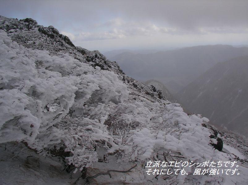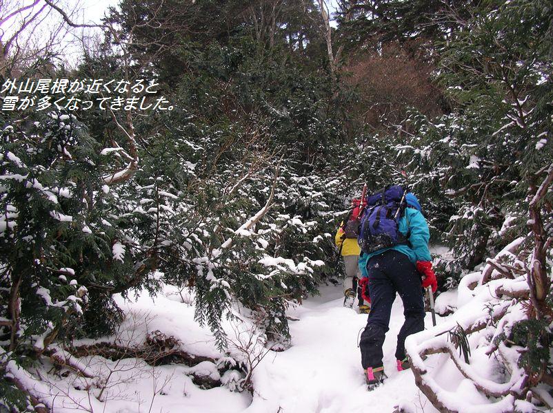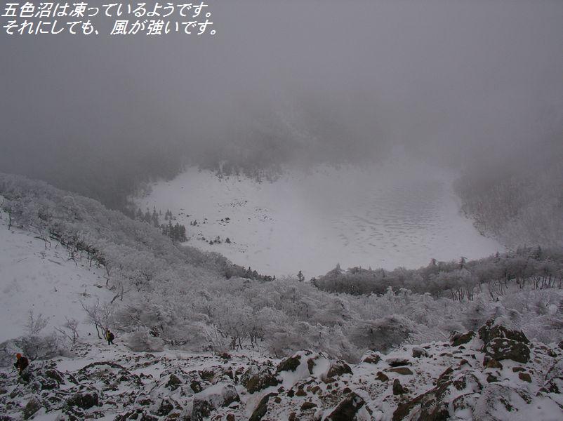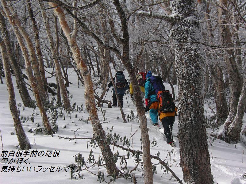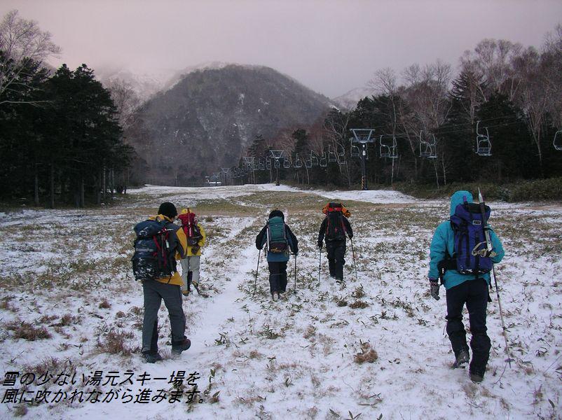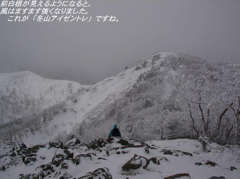 《参加者》植木、稲葉ズ、(遠峰山岳会より)菅野、桜井、(楽稜同人より)西尾 合計6名 《日程》元湯 6:45発…外山尾根…日光白根山頂…外山尾根…元湯 16:00着 《要約》冬山トレーニングに最適な気象条件で日光白根を満喫した。 《本文》 湯元スキー場は雪が少なく『スキー場のオープンはいつなんだ!?』と思うような状 態。スキー場を越えたあ たりから徐々に雪が増えアイゼンを装着。外山分岐まで急登が続く。分岐から急に風 が強くなり、寒さが厳し くなる。寒さのあまり前白根山頂は素通りして非難小屋まで進む。景色(樹氷など)が 綺麗で写真でも撮りたい 所だったが、強風でカメラを出す勇気が出ない。今回の景色は、自分の目で楽しむ事 にする。非難小屋で目出 帽を装着して、みんなギャングみたいな格好になって山頂を目指す。小屋から山頂ま では急登が多く、風が強 く登るのがきつい。ゴーグルが自分から出る蒸気で曇り、視界が狭くなる。風に雪が 舞い、ホワイトアウトな り、自分が何処に立っているか分からなくなったり…と何回か繰り返して…山頂到 着。カメラを出す勇気が出 なかった私とは違って、植木さんは写真撮影をしていたので山頂で記念撮影をした。 (この写真はきちんと写 っていたんだろうか?)山頂でのんびりしている余裕は無かったので速攻下山。非難小 屋まで戻り休憩。小屋 内の気温もマイナスの世界だと思うけど、風がしのげ暖かく感じた。非難小屋って本 当に素晴らしい!!と、小 屋の有り難さをしみじみと感じる。お湯を沸かして暖かい飲み物を飲む。体が温ま る。幸せだ。ザックからペ ットボトルを取り出したら、中の水は凍り始めていた。『気温は一体何度なんだ!?』 ゆっくり休憩をして下山 開始。前白根までの登り返しは、またもや強風にあおられる。外山分岐までくると急 に風が無くなり、風がな いと暑く感じる。分岐で薄着になって急登の下山開始。分岐からの下山は競争でも始 まったかのように、みん な物凄いスピードで駆け下りた。気象条件が申し分の無い冬山だった。