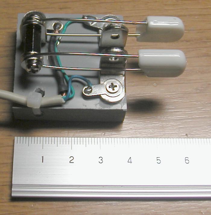 100円ショップで買った大型の安全ピンを使っています。 このまま使うときは、ベースをゴム粘土(パドルの記事をご覧下さい)を使うか 両面テープ等で貼りけます。写真の物はテスト用にシールド線を付けていますが 組込むときは普通の線材でOKです。 100円で5色(2本ずつ)入っていますので、好きな色を選んで下さい。