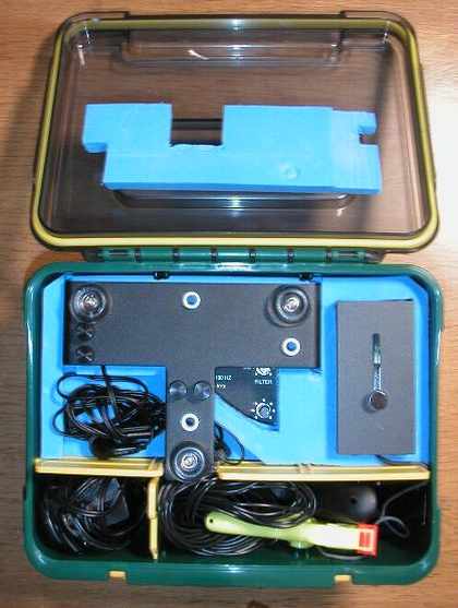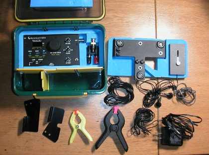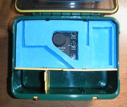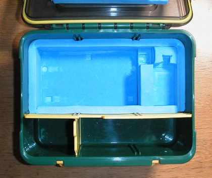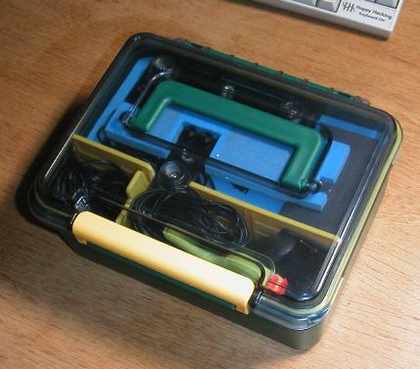 | 左下は電源12V1A、その上はイアフォン、右下は小物類 ふたのウレタンはスタンドとパドルの押さえです |