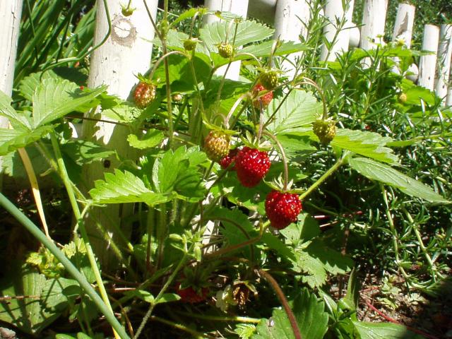 平成13年5月12日撮影 お花はこちらです。 真っ赤に熟した実が30個ほど実っています。昨日の天気がうそのような強い日差しです。 今日のおやつは手作りのクッキーと収穫したばかりのワイルドストロベリーそれとミントティーにしましょう。