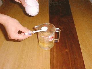 ・上の50ccのゼラチン液を先ほどの ミント200ccに、砂糖と共に加えま す。 (砂糖は小さじ4杯程度) |