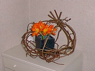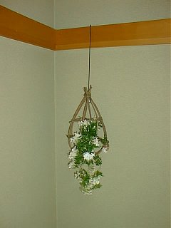 作り方 1)太さ7,8ミリ 長さ70センチ程の蔓4本 2)上部を針金(茶色か黒に塗ったアルミ線か針金が目立ちません)で束ねます。 3)下部を均等な広がりになるように針金で止めます。 4)針金を隠すように、細い蔓を巻き付けます。 5)水滴のような形になるように、途中に蔓で輪を付けます。 6)洗濯屋さんから帰ってきたスーツに付いている針金のハンガーを分解し つり下げる金具として使います。(和室には黒のものがいいでしょう。) 7)小瓶(ドリンク剤の瓶です)を、ビニールテープでとめます。 8)少し長めに切ったジャスミンを挿し、下に垂らすと良いでしょう。