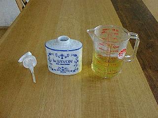 材料はこのぐらい。 1週間分の材料として長さ は約15cmで4本。 リンスの濃さは、一度この 分量で試してから、好みに 合わせて増減して下さい。 はじめはこのように薄めに 作る方が良いでしょう。 |