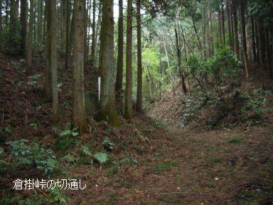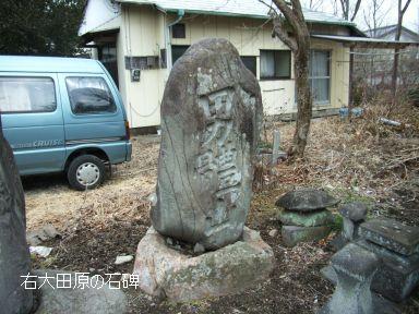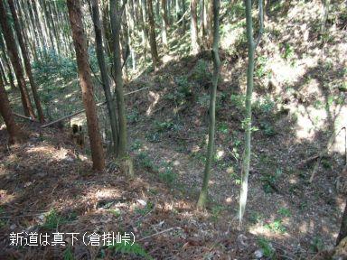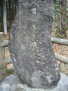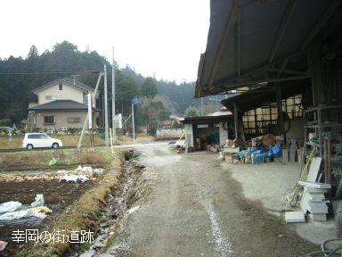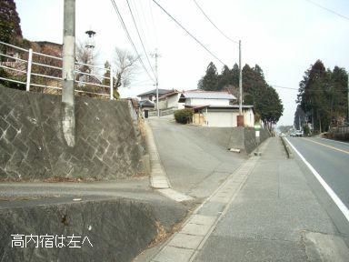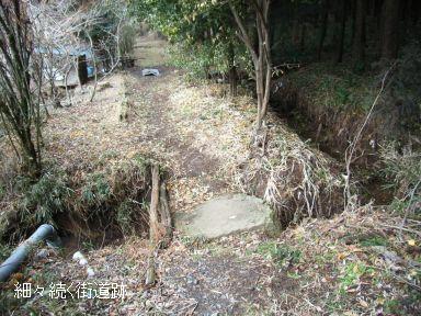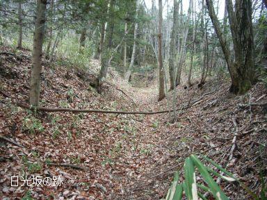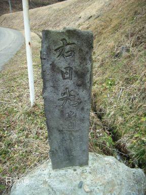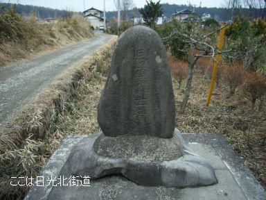 《芦場から矢板》 平成18年2月22日 芦場神社(9:30)玉生宿(10:21)サイカチ橋(11:27)倉掛(12:31)幸岡(13:34) 会津中街道分岐(14:30) 芦場〜矢板 23.000歩 矢板駅から芦場新田まで通学時間を外したバスに乗る。塩谷町の幼稚園前で下車して、 寛永6年に建てた日蓮宗の「南無妙法蓮華経」の台座の道しるべを確認してからスタート する。昔の日光北街道は山際を通っていたというので、まずは芦場神社を参拝する。鳥居 を潜った山中の細い道を辿ると、幼稚園の裏手から農家の庭先に出た。畑仕事をしていた 方に聞くと「そうだよ!これが昔の道だよ」と教えてくれた。断りも無く裏庭を歩くのは 失礼なのだが、道型が続いているので歩いてみた。「源義経の馬の蹄」の跡がついた岩が あるというが何処にあるのだろうか?堀に一枚岩が橋代わりに架けてあるのがこれなのか? 橋を渡ると林道に飛び出る。右側に道標があって「右うじいえ、左大多ハら」と刻んであ る。氏家と言う事は、これは会津西街道の阿久津河岸への道なのだろうか?笹薮で行く手 が塞がれたので国道461号線に出てから、酪農家の庭先から回りこんで見ると、牛舎の向 こうに街道跡がありそうなので藪をかき分けて辿ってみると、石材店の裏手にしっかりと した道があり、林の中には青面金剛像が一基、年号は読み取れないが建立してあった。地 蔵坂を越えると玉生宿に入る。変電所裏の道を歩くが、どうも街道は山際にありそうなの で出会った方に聞くと、「あの奥のお爺さんが詳しいから聞くといいよ」と教えてくれた。 庭にいたお爺さんに話を聞くと「家の屋敷のこの道がそうだ!あの藪の向こうもそうだ」 と言うので一枚写真を撮る。芭蕉通りの石碑の近くに「東 道下原荻の目金枝」「北倉掛 幸岡矢板」「南芦場船生今市」の道標がある。関東バスの駐車場の所に「芭蕉一宿の跡記 念碑入口」の看板に導かれて100mほど入ると笹薮の中に小さな記念碑があった。玉生家の 池を配した庭も今は荒れ放題!これでは宝の持ち腐れ、少しは手を入れて欲しいですね! 鍵の手の道を真っ直ぐ行くと山城の玉生要害山で急な階段を登ると伯耆根神社がある。鍵 の手を曲がると塩谷町役場前の通りで役場の裏の方には昭和35年廃業の東武矢板線線路跡 がある。ガソリンスタンド脇の道を入って行くと、東に向かって細い路地が小学校方面に 続いている、小川の畔で仕事をしていた方に「ここは芭蕉が通った道ですか?」と聞くと 「判りません」と答えが返ってきた。突き当たりの通学路脇に「湯殿山、熊野山、男体山」 三基の石碑が並んでいる、大きな男体山の石碑に「右大田原」の道しるべが彫ってあるで はないか?ここは間違いなく日光北街道なのだと思った。道は小学校裏手から墓地を抜け ると道路に出る。水田の向こうは玉生中学校だ、校門前まで行くが関係者以外は立ち入り 禁止なので仕方なく戻って「梍橋」を渡り見当した場所まで歩くと、なんと!中学校方面 からの繋がりらしい道があった、一基の馬頭尊も見つかった。何処に続いているのかと道 なりに歩くと、田所入口のカーブの手前に出た。五街道分間延絵図によると、この付近に 一里塚が存在した絵が書いてあるが果たして何処にあったのだろう? 閉鎖したゴルフ練 習場付近の林の中にも街道らしき道型が残っている。旧道とバイパスが合流すると間もな く矢板市との境界線で、高台に西国、秩父、坂東の供養塔が建ち「右大田原 左てら山」 の道しるべがある。ここは「上立場」と言われ昔は茶店があったと聞いた。 坂を下ると「立場」である、商店の脇の道を行くとコンコン清水の沸く「小山帰」の部落 がある。立場から先、蕎麦屋さんの前付近から右側の林の中に、古い道型が残っているの でここを強引に歩くと林道に出たので右に折れる。まもなく道が三方に分かれる場所にな るので注意して眺めて見よう。私有地の境界に沿って続いているのが「新道」である。旧 道は林の中に二本あるようだ、一番左が古そうなので倒木を避けながら歩いて行くとやが て二番目のが合流して一本になる。この坂は「日光坂」と呼ばれ藪をかき分けながら進ん で行くと新道が右下10mくらいのところに見える。やがて旧道はスパッと切れた崖となっ て途切れてしまう、仕方なく新道に滑り降りる。新道は切通しとなっており、降りた所に 安政3年の「道供養」と「新路記碑」の碑が建立してある。昔は日光北街道の一番の難所 と言われた「倉掛峠」その改修の苦労が偲ばれる。旧道に登り返して「外出坂」を下って 行くと倉掛の部落にでる。「右日光道」の道標から100mほど登ったところの道路にでた。 火の見櫓を過ぎると倉掛バス停のある国道461号線で右に少し行くと民家の間に舗装され た細い道がある、これが旧街道である。「戸方坂」を越えると「鞍掛松」で説明板が立て てある。今は二代目の松が植えられている。国道461号を進んでいくと、「合会バス停」 がある、その先右側に造成地の荒地があるがそこが