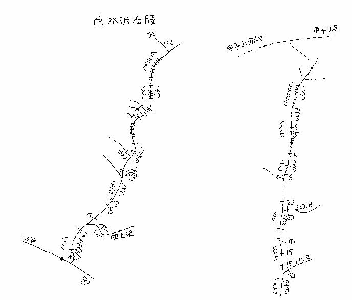 白水沢の入口は、甲子温泉を過ぎて本谷を橋で滞り、登山路を 五分程登つてから右へ沢に入る道があるので、ここを歩く。滝に 出合ったら、右岸をまきぎみにして落口に出る。右から入つて来 る沢は吹上沢である。衣紋の滝は水量が多いので、いかにも滝ら しい。ここまでは甲子温泉からも楽に来る。道もあるのでよごれ ている。マキ道のしっかりしたのが右岸にある。衣紋の滝を過ぎ てから二段に落下するのが、チョンチョンの滝と云われており、 ルートは右岸よりにへづり、そのまま直登する。危険な滝もなく 二股に着く。出合に大きな木があり、矢板岳友会の小さな道標が 打ちつけてある。左股は暗い感じの沢で、沢床は赤い。十五分ほ ど歩くと右手から三十mの滝が落下している。これは、一の沢で ある。左股には十五mの滝がある。直登は取りつきはいやな場所 であるが、ついてしまえばホールドもしっかりしているのでむず かしい所ではない。マキ道は右岸上部が少し悪い。登りきって大 きく右に曲ると沢をせきとめて、どうどう落ちる滝に出る。上部 がハングしているので、左岸のガレを登ってまく。まもなく右手 より五十mの滝がある。二の沢の出合である。左股には二十mの 滝がかかる。水量が多い時には左右登れるが、水量の少ない時は シャワークライムで登ろう。ナメが現われるともう源流である。 注意しないとスリップするので、基本を忘れずにネマガリダケが 両岸からかぷさって来たら右岸にとりつき、十分ほどヤプをこぐ と甲子峠からの縦歩路に出る。左へ十五分ほどで甲子山への分岐 点、ここから甲子温泉までは一時間の下りである。