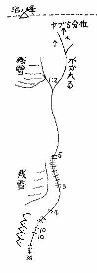 滝を越すと、沢が右から入る。水量は一対一である。左股には五メ