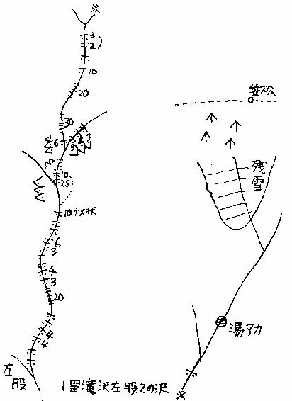 一里滝尺左股二の沢 一里滝沢出合八時十五分。一の沢の出合で池上、江連と別れる。 九時四十分。二の沢出合。水量は一対一。荒れたゴーロ帯をすぎる と小滝が表われる。砂岩のせいか沢床がきれいである。この沢の大 滝が二十五メートルは大きい。下部はハングしており、とても登れ ず、左岸をまく。六メートルをこせばナメが続く。この沢はわりと 小滝が多く楽しめる。まもなくイオウの固りの場所に出る。ここを 掘れば温泉が出るかも。そのせいかムカデが多い。何十匹といる。 一の沢のパーティーと交信。源流となり、十五分ほどヤプを越えた ら笠松の所に出た。十二時五分。ボウズの小屋で休んでイダテン走 り。甲子に三時につく。 昭 四九、六、二十三 (松尾・小林 記)
