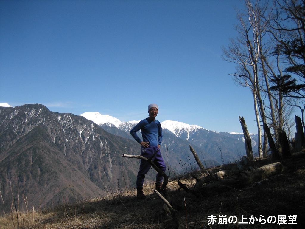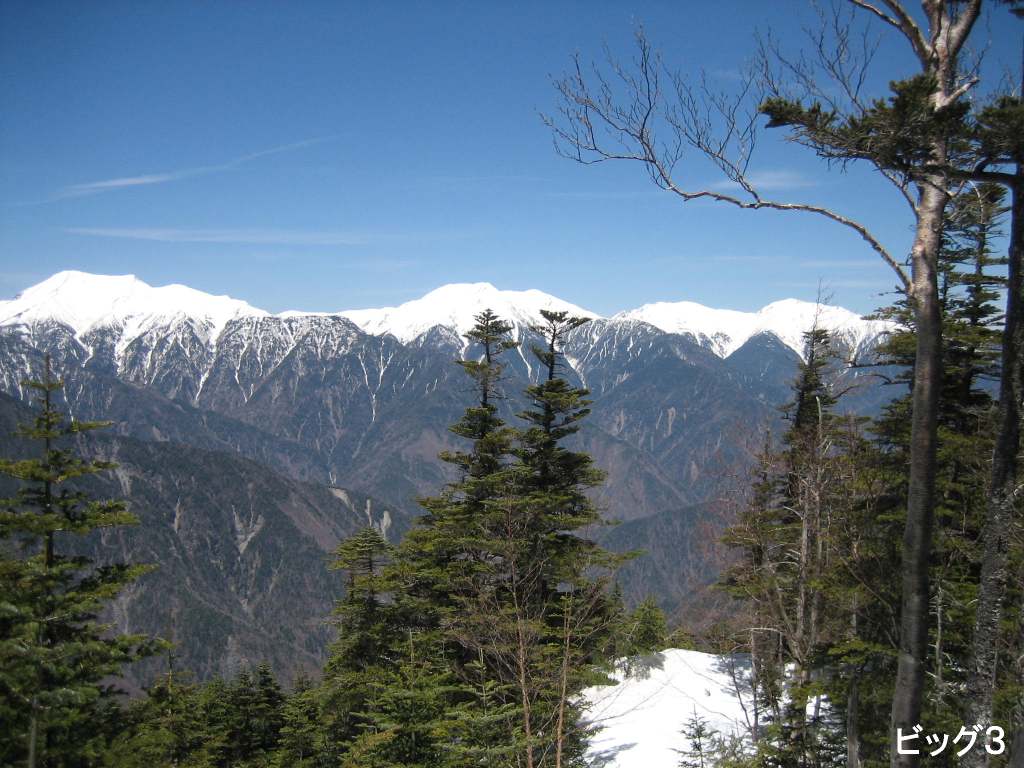 2007.4.29 畑薙ダム5:30→6:30登山口→8:00池の平→10:45青薙山11:30→15:00畑薙ダム 南アルプス南部のビッグ3悪沢・赤石・聖を見るには、ちょうど北アルプスの蝶ヶ岳のような存在が 青薙山だ。 しかし、蝶ヶ岳に比べてなんと地味な山だろうか。おそらく登山者は年間で数100人だろう。 前日の夜に畑薙ダムゲートに駐車し、車中泊とするが、非常に寒い。 寝不足の体に鞭打って登山口へ、此処からはいきなりの急登だ、たっぷり汗を掻いたら池の平につく。 別天地のような平地で、湧き水がある。素晴らしいテント場だ。 やがて赤崩を怖々と覗き込んで、道は北上する。このあたりは赤布も少なく勘を頼りに登る。標高 2100mあたりから残雪があり、その上に薄っすらと新雪がある、昨夜は寒い訳だ。 山頂付近は思いの外深い残雪、ビック3の眺めは予想通り素晴らしい。