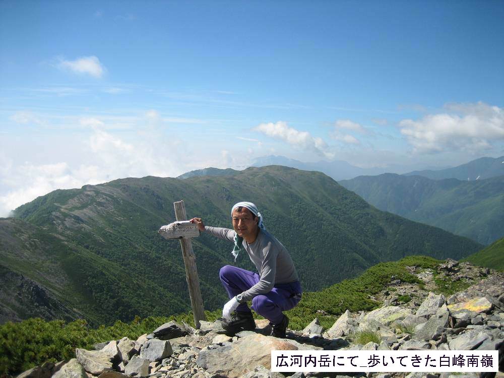 広河内岳に立つのは30年ぶりだ。振り返れば歩いてきた白峰南稜は大蛇のように続いている。