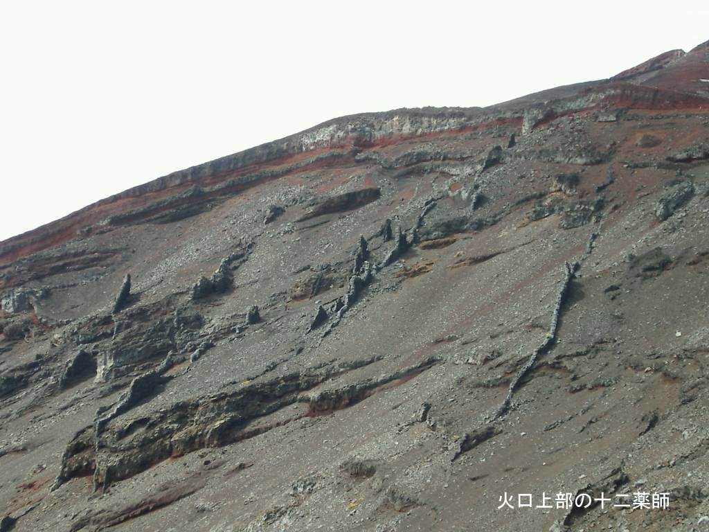 火口壁上部に見える岩脈は「十二薬師」と言われているが、