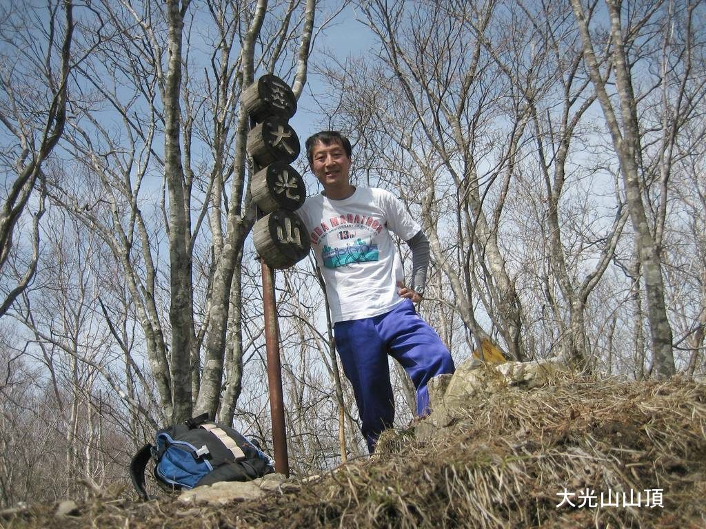 2007.4.1 梅ヶ島8:30→10:00造林小屋→11:00大光山11:30→13:00安倍の大滝→13:45梅ヶ島 雨上がりの休日、展望に期待して行きました。 静岡市の浅間神社から始まった尾根は、賎機山で産声を挙げ、竜爪〜真富士〜青笹〜十枚岳と続き大光山(1661m)を 経て山伏岳で2000mを超え、最後は本邦第2位の高峰北岳(3192m)となる。 大光山は十枚岳と八紘嶺に挟まれた地味な山だ。 タチ沢沿いに高度をあげて、造林小屋で小休止、水場もある。ジグザグの急登を行けば支稜に出る、西からの強烈な風 に吹かれるが風自体は温かい、予報によれば今日は黄砂が飛んで来るらしい。 このあたりから南アルプスの山々が見える。山頂から稜線沿いの道は、笹が刈り払われており歩きやすい、ただ鹿に皮 を食われた木が多い。 下山は遠回りだが安倍の大滝に降りる。昨夜の雨で迫力があるはずだ。 梅ヶ島温泉はヌルヌルした美肌の湯、マイカーのため一杯飲めないのが残念。