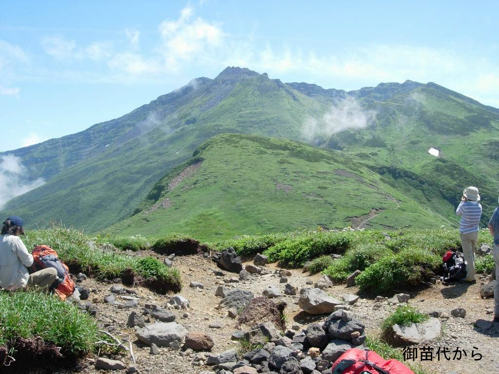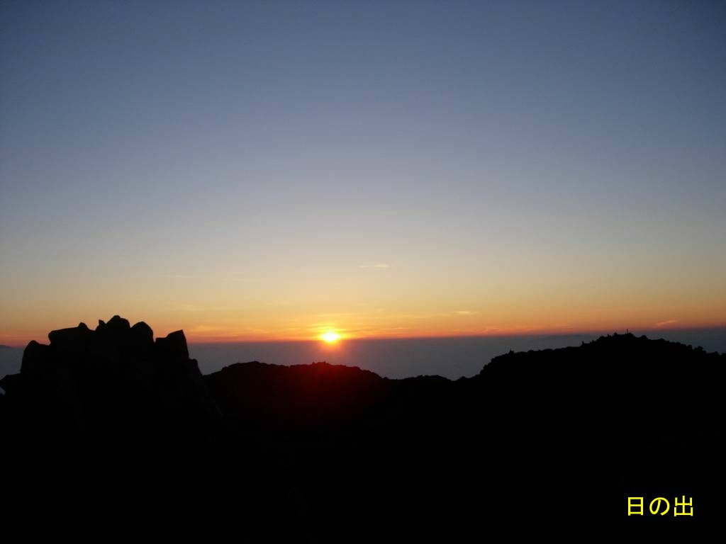 山 行:鳥海山 (山形県) メンバー:24名 日 程:平成18年8月5日(土曜日)〜6日(日曜日) コ ー ス: 5日:宇都宮(4:00)⇒鳥海高原ライン終点(10:20)(10:50)・・・滝の小屋(11:15)・・・河原宿(12:30) (13:00)・・・伏拝岳・・・御室小屋(16:45) 6日:御室小屋(4:00)・・・ 鳥海山(4:25)(5:00)・・・御室小屋(5:25)(7:20)・・・七高山(7:40)(7:50) 御浜小屋(11:00)(11:20)・・・犀の河原・・・鉾立山荘(13:00) ⇒ 象潟・ねむの丘 ⇒ 宇都宮(22:40) 【 感想 】 今日の天気は快晴です。 雪渓の上を歩るいているせいでしょうか?爽やかな天候の中、足取りも軽やかに登って行きます。(⌒Э⌒) 雪渓を過ぎると、お花が咲いていました。お花を見ながら登って行くと御室小屋に到着しました。 次の日、夜が明ける前に鳥海山に登って行き、山頂から日の出(4時30分頃)を見ていると、 日本海に 影鳥海が映しだされました。映し出された影鳥海は まるで女性のような美しい姿に 皆さん口々に「わぁ・・・素晴らしい」と歓声をあげ観いっていました。 下山は、沢山の種類の花が競い合って咲いているお花畑の中を、ゆっくりと下山する事が出来ました。 又、「象潟・ねむの丘」の、広々とした温泉で、日本海を見ながら汗を流した後、昼食を美味しく頂きました。 今朝、見た影鳥海を思い出しながら、栃木へと帰ってきました。 皆さん 楽しい山行有難う御座いました。(^〇^)♪ё♪ё♪ё