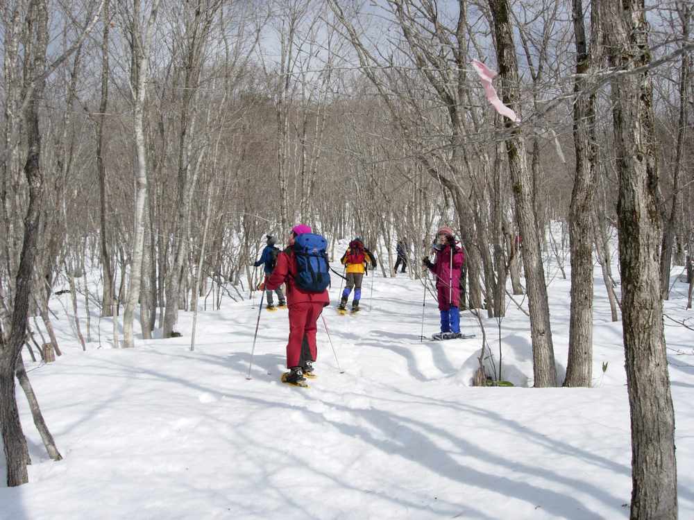 リフトを降り早やる気持ちを押さえスノーシューを付け身支度を済ませた後、歩き始 めました。