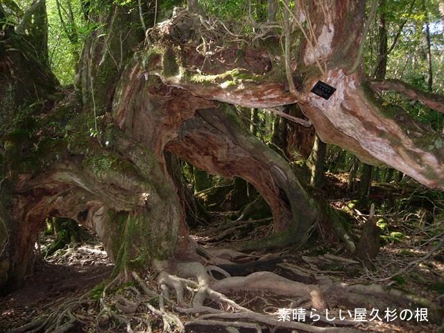 山 行:屋久島/宮之浦岳 メンバー:赤羽 x2/板山/他 日 程:平成18年11月10日(金曜日)〜13日(月曜日) コ ー ス:10日:宇都宮(4:00)⇒屋久島空港(11:40)⇒千尋の滝⇒トローキの滝⇒大川の滝⇒温泉⇒森のひだまり(泊) 11日:森の陽だまり(5:00)⇒淀川登山口(6:05)〜花之江河(8:50)〜〜 宮之浦岳(11:45)(12:20)〜花之江河(14:35) 〜花之江河(14:35)〜淀川登山口(16:50) ⇒ 森のひだまり(泊) 12日:森のひだまり(5:00)⇒荒川登山口(6:30)〜ウィルソン株(9:55)〜大王杉(10:55)(11:15) 縄文杉(11:55)(12:25)〜ウィルソン株(13:50)〜荒川登山口(16:50)⇒屋久島つわのや 13日:屋久島つわのや(8:00)⇒白谷雲水峡(8:50)(12:30)⇒屋久島空港(15:40)⇒宇都宮(22:00) {白谷雲水峡駐車場(8:50)〜三本足杉(10:05)〜もののけ姫の森(11:20)〜白谷雲水峡駐車場(12:30)} 11月10日(金曜日) 宇都宮を4時に出発し、屋久島に11時に着きました。屋久島空港から千尋の滝、大川滝、トローキの滝と見学した後、海中 公園温泉で露天風呂に入る人、足だけ入れる人等それぞれいました。又道路沿いには、南国を思わせるように色々な花が咲いて いました。 11月11日(土曜日) 森のひだまりを5時に出発し、淀川登山口で準備体操をし歩き出しました。歩き始めは、ヘッドランプを付けて歩きましたが、 20分位で明るくなって来ました。投げ石岳辺りで、雨がポツポツとしてきた為、カッパを着ました。2時間位で雨も止み、太 陽が顔を出してきました。太陽に照らされたヤクザサは一段とグリーン色に光、とっても綺麗でした。ヤクザサの中から色々な 形をした円やかで大きな岩が所々に点在していました。宮之浦岳山頂は、残念な事にガスがかかってしまい廻りを見渡す事が出 来ませんでした。下山は同じ登山道を帰って来ました。ヤクザサと円やかで大きな岩が点在していた写真を撮ろうと、思ってい たのですが、下山時はガスが掛かってしまい写真が取れなかったので、非常に残念で心残りです。 11月12日(日曜日) 今日も歩くぞー!と気合を入れ、トロッコ道を延々と8Kmも歩いて行きました。大株歩道入り口に着き、美味しい水を飲ん だ後、翁杉、ウィルソン株、大王杉、夫婦杉、と登山ガイドさんの説明を聞きながら登って行きました。今日のメインとする縄 文杉へと登り詰めました。登山ガイドさん(日高さん)の説明によりますと、縄文杉を見る為の展望デッキを作ったことにより、 縄文杉が太陽に照らされ木肌が白くなってしまったと言う事でした。下山も同じ道を帰ってきました。トロッコ道は、板の上を 歩く為か、とっても疲れてしまいましたが、つわのやの温泉に入り疲れが取れました。 夕食は、大宴会となり あ!言う間に時が流れてしまいました。お休みなさ・・・い( ̄‐ ̄) 11月13日(月曜日) 今日は、白谷雲水峡を歩くコースです。弥生杉、二代杉、三本足杉、三本槍杉、くぐり杉、もののけの森、さつき吊橋と歩き ましたが、苔が瑞々しくとっても美しい所でした。雨の多い屋久島で、雨に降られたのは、2時間位で済み私達に取っては大変 良い山行でした。 皆さん楽しい山行の旅、有難う御座いました・・・。V(⌒▽⌒*)〜☆ 追記:1、 登山ガイドは、地元の人が3割で、他県から来た人が7割だそうです。 2、 屋久島には、千年以上の杉が2000本以上あるそうです。 3、 水が綺麗過ぎて、魚が育たないそうです。 4、 水は、何処にでもありとても美味しいです。 5、 お米は、雨が多すぎて取れないようです。