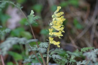仙人通信L(花の山高尾山) ヤマルリソウを大山に見に行こうと思っていたのだが、足が高尾に向いてしまった。 日影沢のキャンプ地に駐車して高尾山山頂をめざした。キャンプ地の沢沿い一面はニリンソウである。 1分も歩かないのに、木漏れ日にニリンソウの薄ピンクの花弁が浮かぶ、シャッターを切る。 せり科のセントウソウも春を告げる。林の中では白い花弁を重そうに俯きながらミヤマカタバミが咲き 乱れる。いたる所にマムシ草の仲間のミミガタテナンショウがにょきにょきと頭を擡げている。 せせらぎの岸にはエンレイソウが数本咲きだしている。タチツボスミレが咲いている、とその間にギザ ギザの葉に大柄で薄ピンクの花弁のエイザンスミレが花を付けている。沢沿いや日陰ではユリワサビ の白い花がこちらを向いている。小仏峠に向かって500m位歩るくと、林道の左に登山道らしき岨道 を見つけたので、進路をとった。マルバスミレに混じり大きめのナガバノスミレサイシンが目立ちはじ めた、日陰でありカメラにリングフラッシュを付けて100mmマクロでシャッターを切る。 陽だまりでは咲き出したばかりのミヤマキケマンがみずみずしい。小さな丸い紫色の花を足元に感じて よく観ると大山に見に行こうとしたヤマルリソウではないか。寒い性だろうか、蕾はあるが花が少い。 近くを探してみたが3株とも同じ状態であったが、会える事に希望を繋いだ。約1時間で高尾山の山頂 に着いた。山頂は桜の花が見頃であり、お弁当を広げている多くのハイカーで賑わっていた。 城山までは約1時間である。尾根道は桜・ミツバツツジ・コブシの木々、山吹・木苺の白い花、そして スミレの花街道である。尾根の北側の捲き道を通り歩くと、タカオ・エイザン・アオイ・タチツボの各 スミレが咲く。一丁平の近くでは15cm位の丈のイカリソウがピンクの花を付けている。5本程のヒ トリシズカもそっと、けな気に咲いているが、殆どの人は気づかないで通りすぎて行く。 アズマイチゲがキャンプ地の近くに咲いているとの情報を貰い、城山からは無線中継所用の日影林道を 下山し探してみることとした。林道の陽だまりにはアオイ・マルバそして茎の細長いヒカゲの各スミレ が、叉ミヤマキケマンが咲いている。林道のゲートから下ではヨゴレネコノメ・ネコノメソウが元気だ。 日陰の性であろうかシャガも白い花弁に黄色い蕊が似合う。下山して1時間位歩いたろうか、フタバカ ンアオイが1cm程のクリーム色をしたベレー帽状の花を付けているのを発見した。群落は2箇所のみ であった。いろはの森の近くでアズマイチゲを探したが、トウゴクサバノウとコチャルメルソウ・カキ ドウシを見出したが出会えなかった。諦めて車に戻ろうとした時、沢の対岸に青紫の小花、満開のヤマ ルリソウを発見した。5時間程の高尾山の散策で20以上の花と出会え40枚以上のシャッターを切る 事が出来た。たかが600mと侮るなかれ、確かに高尾はスミレをはじめとした花の山である。 日の光を受けて咲くキケマン(h17.4.15)