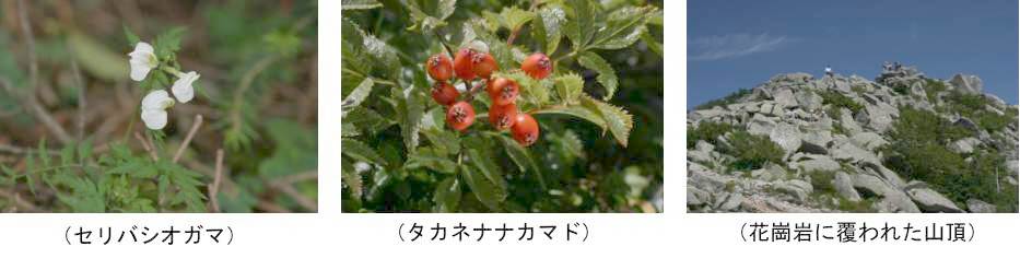 仙人通信23 金峰山(2598m) 月曜日の朝9時前と言うのに大弛峠の駐車場は20台近い車だ、百名山に選ばれるだけの事はある。 大弛峠の駐車場は海抜が約2300mあり、金峰までは、高低差300m程の緩やかなシラビソ林の登りから 始まる。北奥千丈から朝日岳の一帯のシラビソ林は、縞枯山同様に縞枯れ現象が観られる。しかし縞枯 山の様に太い幹が中心でなく、幹径が5cm程度でも枯れているのが目立つ。 シラビソ林はスギゴケ類に覆われ、昨夜の雨をたっぷり含んだ蘚類は、生き生きして綺麗だ。 太いタケカンバやシラビソに覆われた小さな広場、その中央にケルンが詰まれた朝日峠に30分で着く。 ここからの登りは急勾配となり、体が汗ばむものの、木に覆われた尾根道は、風が抜けて爽やかだ。 花の終ったゴゼンタチバナの小さな葉が至る所にあり、7月頃であれば見ごたえを感じる。朝日峠から 40分程で石楠花の小道に変わり、朝日岳(2579m)の山頂に出た。行く手には金峰山頂の五丈岩が望め、 富士山・南アルプス方向は雲に覆われているものの、他は真っ青の晴天である。1時間半位で山頂に立 てそうだ。足元にはアキノキリンソウ・薊に似たヒゴタイ・赤い実のコケモモが点在する。道は鉄山を 巻き、シラビソやトウヒの林で、なだらかだ。白い小さな花を見つけて、カメラを構えていると「何の 花ですか」と声を掛けられた。「シオガマに似ているですが、よく判らないんです」なんて会話をして いると、周囲に人が集まり撮影場となってしまった。(調べましたらセリバシオガマであることが、判 りました)1時間程でシラビソの林からハイマツと石楠花の登山道となり、ツガザクラが地面を覆う亜 高山帯に変わった。賽の河原では、コケモモとタカネナナカマドの実が赤く熟れ、日の光に輝いている。 金峰山・山頂は、白い花崗岩に覆われ、周囲を眺める広さもないので五丈岩まで進んでみた。五丈岩を 目前で見るとその大きさに圧倒される。ハイマツ・ナナカマド・コケモモ・ツガザクラ・トウヤクリン ドウ・ヒゴタイ・それに白いコゴメクサの花が辺りを埋め尽くしている。茅が岳・八ケ岳・浅間山が、 そして眼下には瑞牆山が白い奇岩を見せてくれている。富士山が望めたら最高の100名山なのに残念だ。 賽の河原まで戻り食事をした。眼下には信濃川上から三国山に掛けて、ビニールハウスで白くなった盆 地が見える。五日市―川上構造線が眼下に望め地理の勉強を実地でしているようだ。ところで「関東山 地」との表現をご存知でしょうか?。愛川―藤の木構造線・武蔵丘陵・中央構造線・岩村田―若御子等 の断層で囲まれた範囲で、その背骨が雲取山からこの金峰山まえ続く2500m級の山である。その中心が 秩父帯と言う岩石から構成されているが、金峰山・国師から大菩薩峠に掛けては花崗岩により構成され ている。山頂の風化した石を良く見ると、雲母の含有量が意外と少ない花崗岩である事を確認し、納得 した。車で下山中に沢で顔の汗を流して、ふと見ると紫のトリカブトが一輪咲いて居てくれた。 6時間余りの勉強した登山でした。 (h17・8・29)
