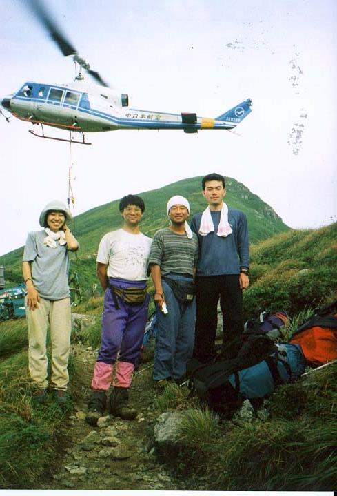 (北股岳と梅花皮小屋新築の資材を運ぶヘリをバックに)