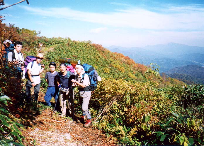 古寺山に向かう稜線から右奥後方に月山を望む。