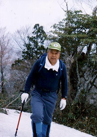 男鹿岳への登り、雪面を登る小林会長