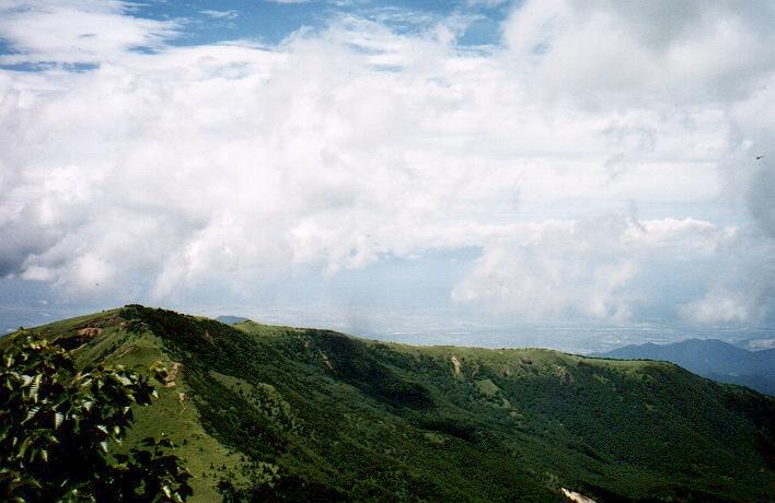 四阿山頂上から菅平の登山口方面(右端)を望む