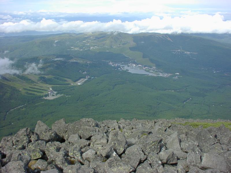 9月10日、頂上より、白樺湖、霧ケ峰(後方の山)を見る