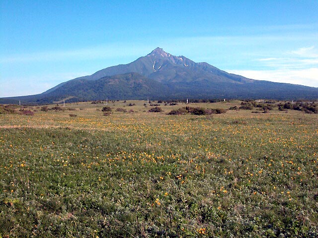 ャンプ場へ向かう途中、少し足を伸ばして利尻空港近くのエゾカンゾウの咲く原野から利尻山を撮影した。