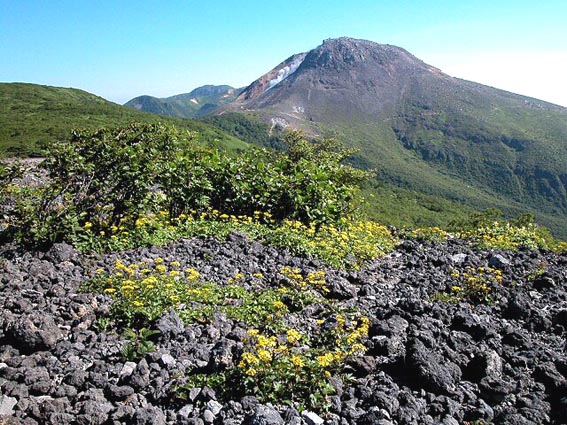 南月山の少し手前の尾根筋に今年も変わらずにコキンレイカの黄色い花が一杯咲いていた。