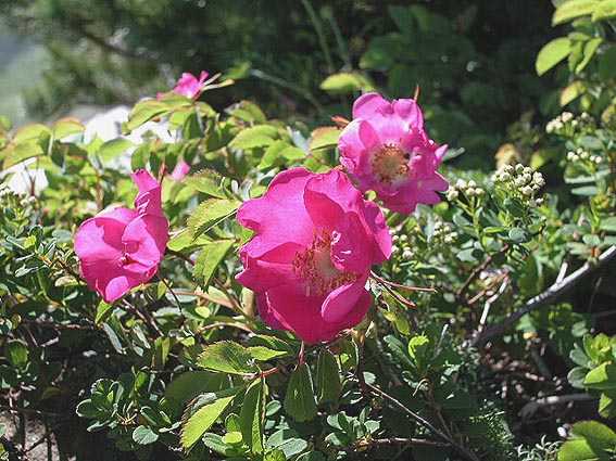 ったのが、このタカネバラだった。真夏の強烈な日差しを直接浴びるには気の毒に思えるようにしお