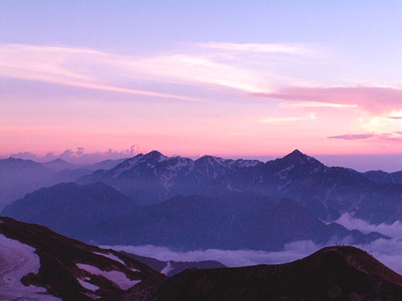 読みながらシャッターを切った。夕日は、期待を裏切らず杓子岳と白馬鑓ケ岳を赤く染めてくれた。