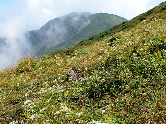 熊見曽根近くに来る頃になるとガスが周囲の山々を隠し始めた。ガスの切れ間から三本槍ケ岳が姿を 現した。シラネニンジンの花もそろそろ終わりに近づいていた。