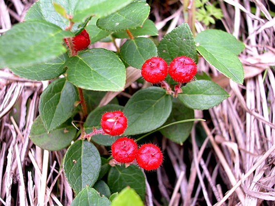 帰路、剣が峰のトラバース登山道沿いのアカモノをやっと見つけた。春先の白い可憐な花は目に付き やすいのだが、この時期は他の草木の葉に隠れ目に付き難い。それでも今年も真っ赤な実を付けていた。