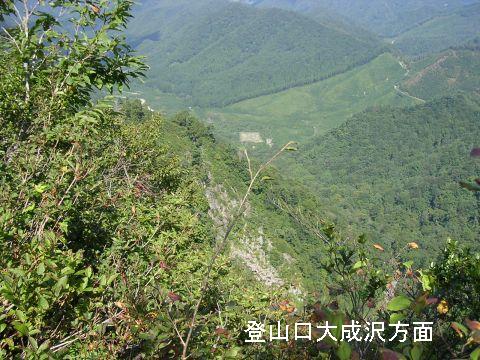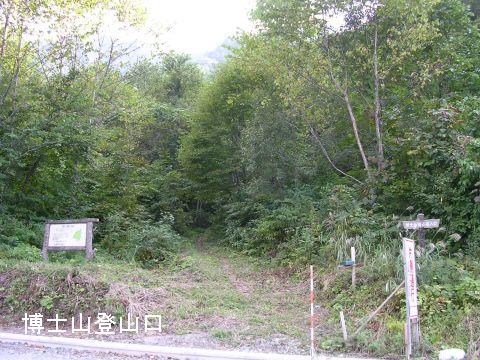 道が狭くなってくると大成沢部落、林道の入り口に博士山登山口の標識が大きく掲げてあ