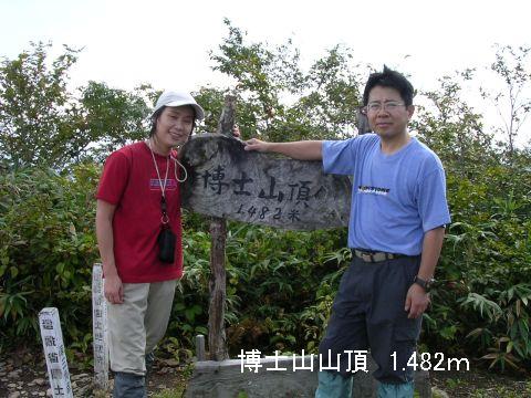 博士山山頂に飛び出す。我々3人だけの静かな山頂だ。記念写真を撮り、待望のお昼。