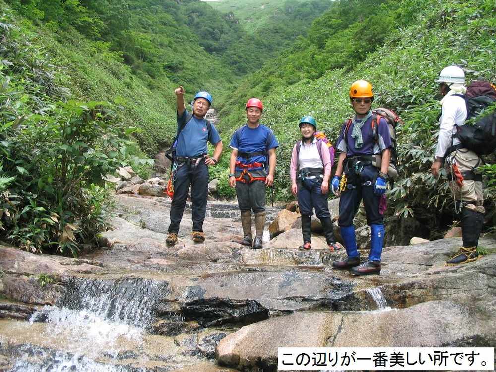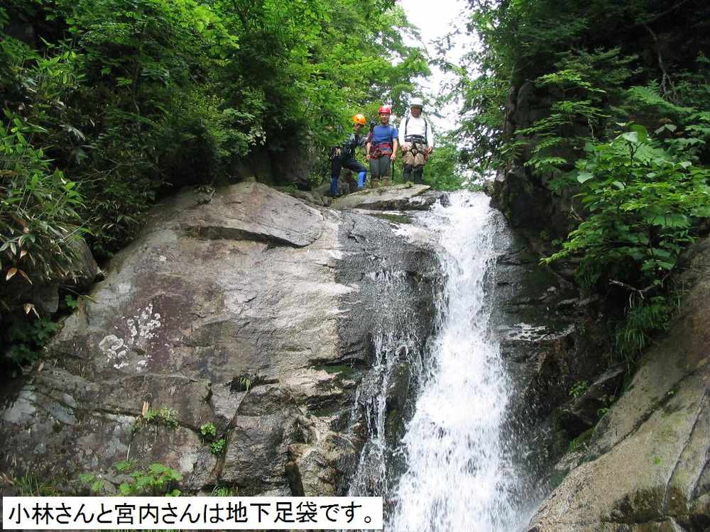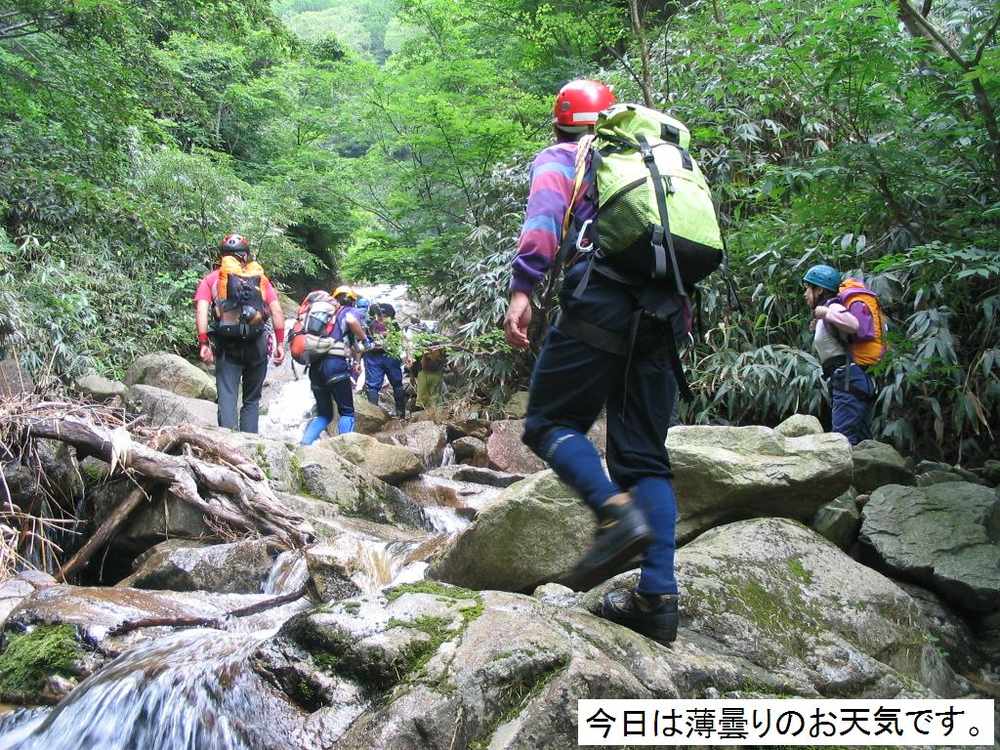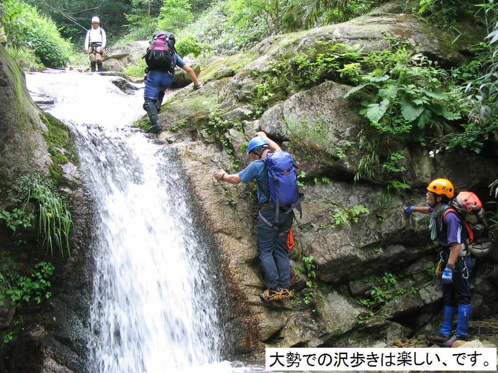 られます。最初の小滝を越え尚も進むとF1に差し掛かります。今回は人数が多い事もあり、直登Grと高巻きGrと