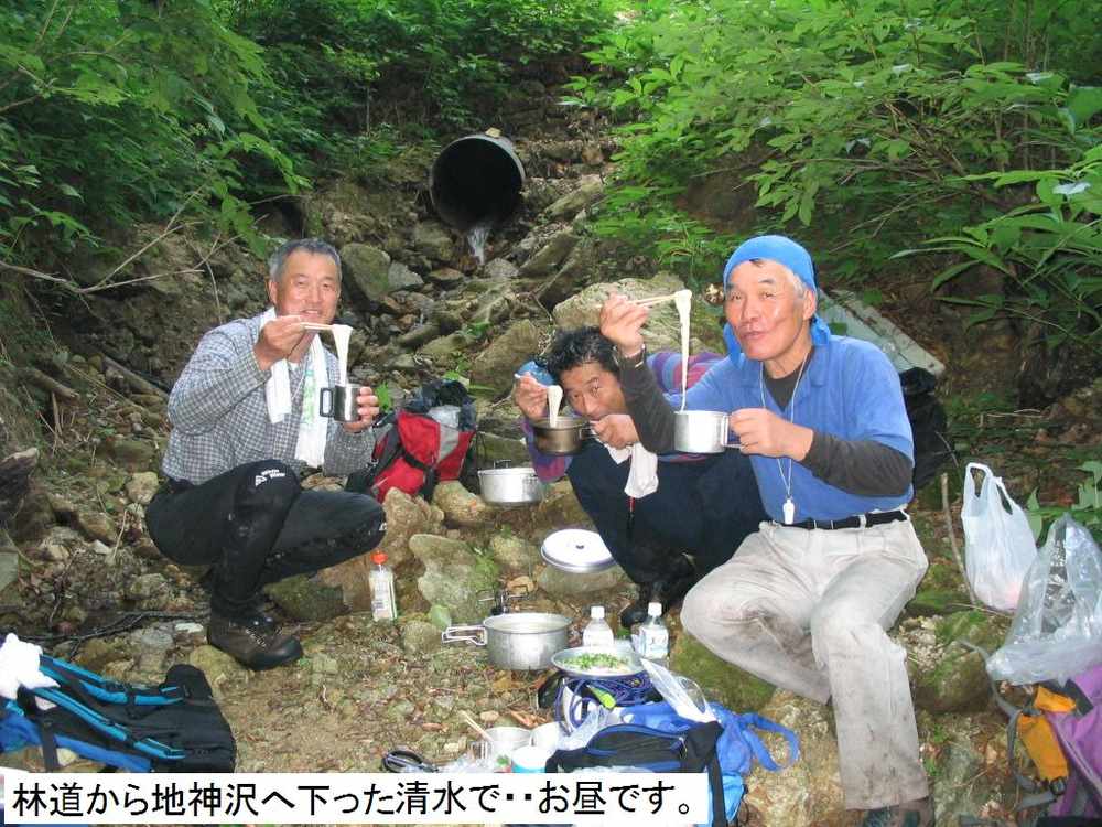 尾根から地神沢を下降する。林道を越えた所で清水が出ている所があったので漸くお昼・・。あっと言う間に8人分の