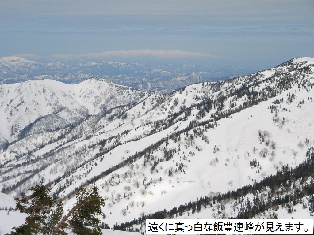 その後方には真っ白な雪を被った飯豊の山々が見える。一通り景色の楽しんだ後、風を避け楽しい昼食と