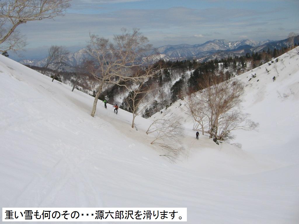 少しいい気分になった後、いよいよ滑りに掛る。源六郎沢を滑る事にする。予想通り雪が重い。『どう